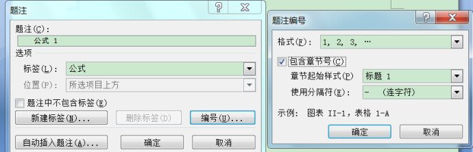 光标放在公式之后,不要(注意是“不要”)选中公式,在“插入|引用”菜单选“题注”(2007中是引用-插入题注),由于没有选中项目,所以“位置”一项为灰色,新建标签“公式1-”,在编号一项选中包含章节号,点击“确定”。