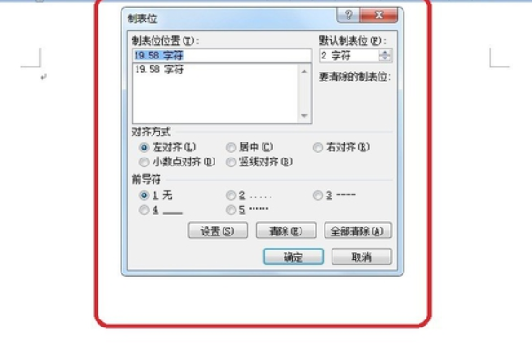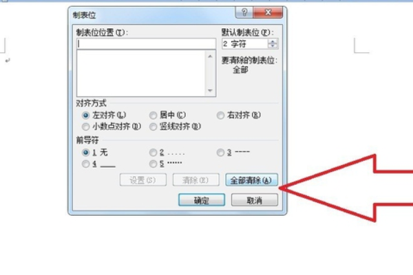 3、点击对话框右下方的“全部清除”,清除已有的制表位位置。