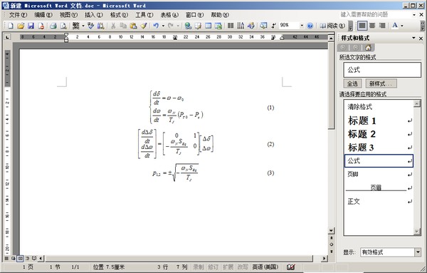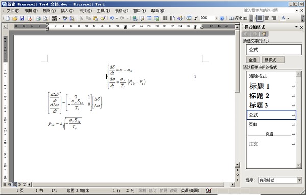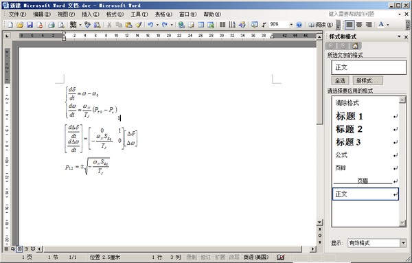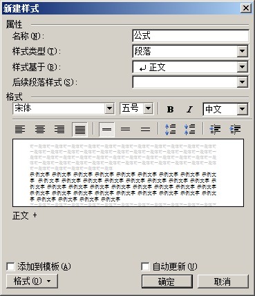 把公式段落的设置保存为样式的方法:公式的格式设置好后(即已通过题注插入编号,并且已通过制表位设置公式居中、编号在右边行末),选中该公式及其编号,点击“格式|样式和格式”,这时在word右方出现“样式和格式”栏,点击该栏上部的“新样式”,即弹出“新建样式”框,将框里的“名称”改为你熟悉的名称,例如改为“my”,然后确定,则“my”就出现在word右边的格式设置栏里。新公式段落应用此样式的方法:题注给新公式编号后,选中公式和编号,在