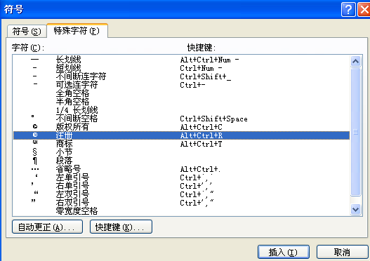 按“Alt+Ctrl+R”组合键即可快速的输入一个“注册商标符号”®。