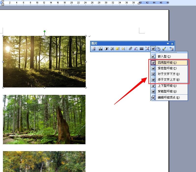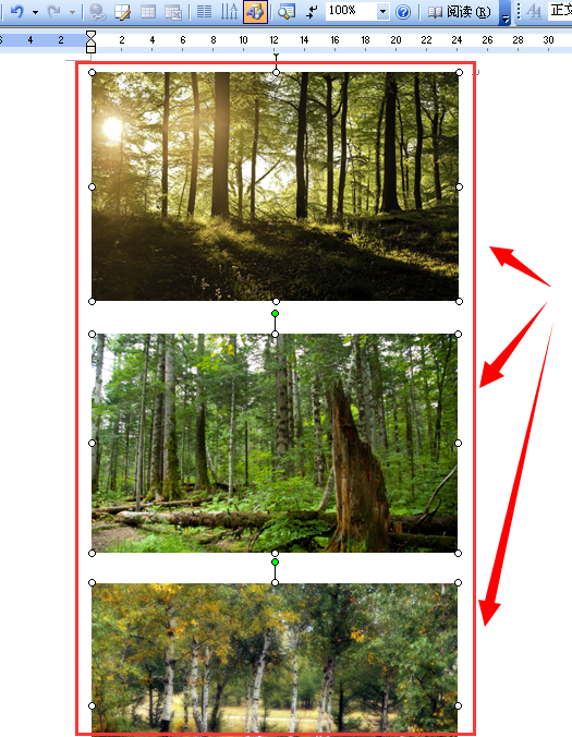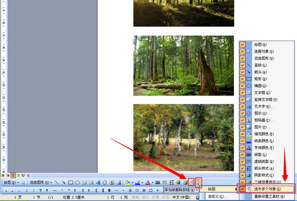 所有的图片都确定为非嵌入型之后,按住键盘上的Ctrl键不放手,逐一点击需要选中的图片,即可同时选中多个图片了。