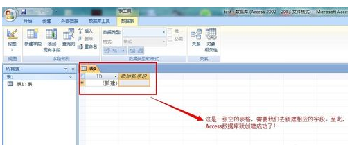 4.进入Access数据库界面,有一张空白的表格,这个表格就是字段表。需要添加相应的字段,才可以添加用户数据等信息。至此,Access数据库就创建成功了。