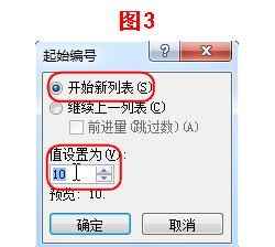 3、在弹出的”起始编号“选项卡中进行设置,这里将编号值改为”10“,然后单击”确定“。