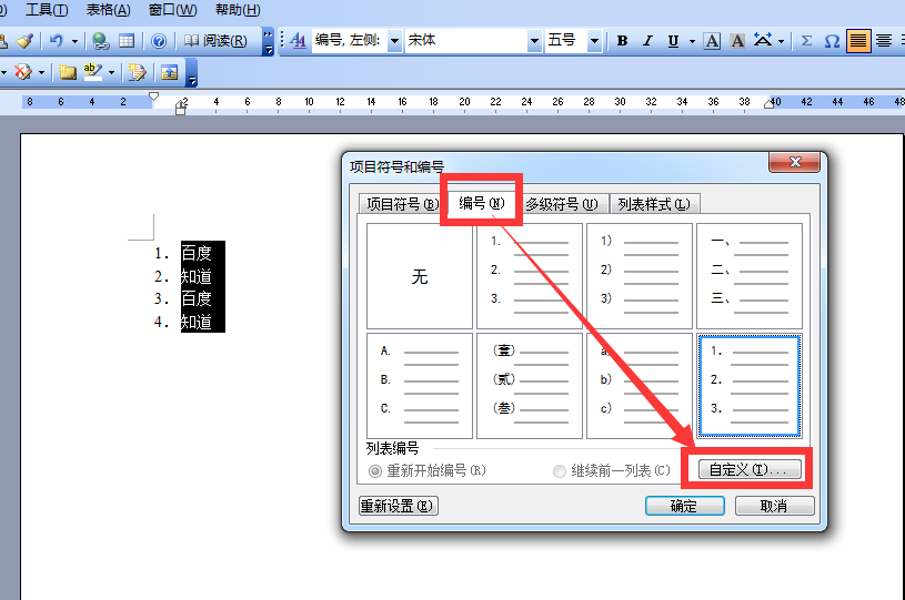 若编号界面上没有提供的样式,也可以点击”自定义“的按钮;