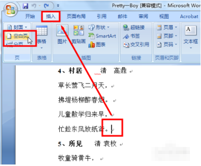 2、然后定位好光标位置,依次点击插入-空白页选项。