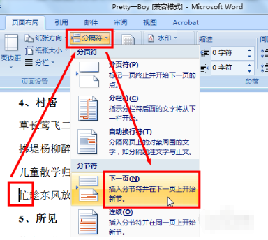 4、还有一个方法。首先还是需要定位光标,然后依次选择页面布局-分隔符-下一页选项。