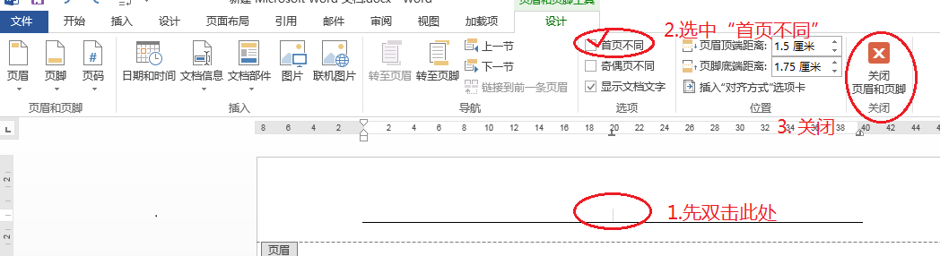 另外,在有页眉页脚的文档中,如果为了得到一张纯空白页,那么在以上操作的基础上,还需要在第一张上页眉处双击,点“首页不同”前打勾,再点“关闭”,如图: