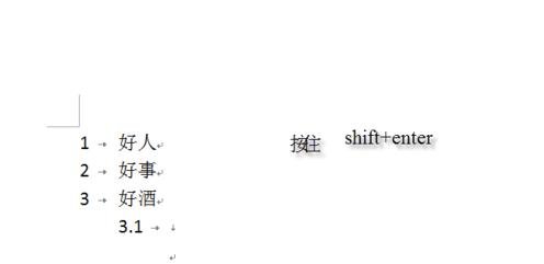 当您想要的是返回到更高级的编号时候,比如从3级编号到2级或者1级编号时候,按住shift+Tab即可。