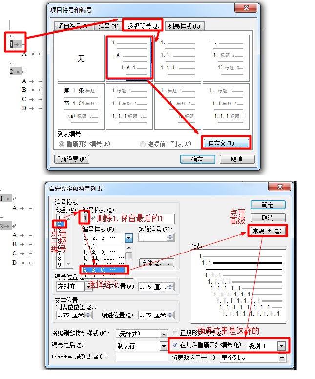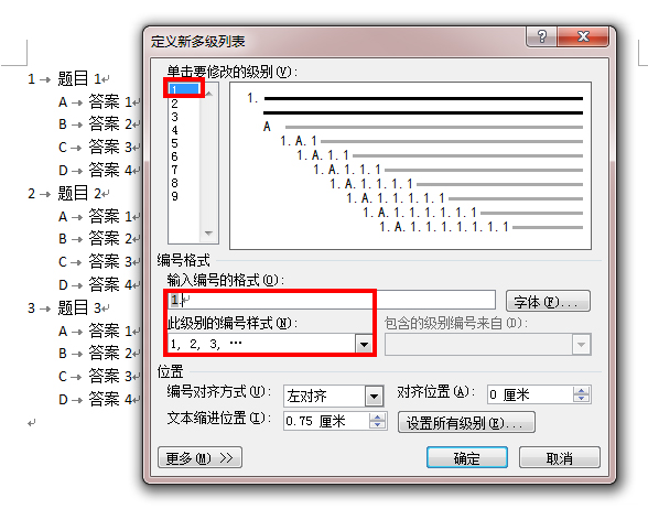 首先将1、2及其答案设置成多级编号格式,方法如图