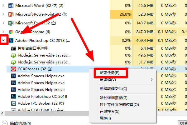 3、如果只需要关闭软件的某一个进程,可以点击软件前面的展开按钮将所有进行展开,然后右击想要关闭的进程,在展开的菜单中点击“结束任务”按钮即可: