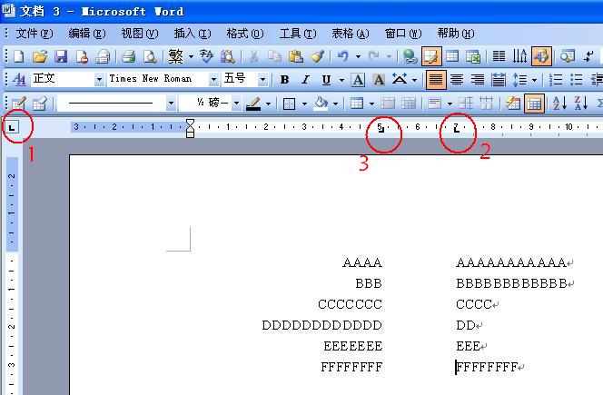 输入文字时,每一行连续输入,不空格。输入完成后,在每一行的前面,按一下Tab键,整行文字会在圆圈3处右对齐。再在要分开的地方插入光标,按一下Tab键,这部分就自动地在圆圈2处左对齐了。