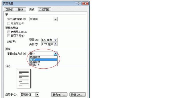 2、弹出页面设置对话框,选择版式选项卡,在垂直对齐方式处选择居中即可,如图所示。