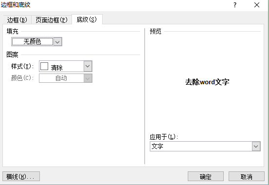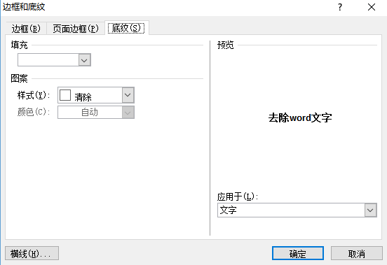 3.在“边框和底纹”对话框中,选择“底纹”。“填充”选项下更改为“没有颜色”,“图案”的“样式”选项下更改为“清除”,然后点击“确定”;