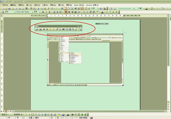 插入→图片→来自文件,选择一张图片,选定图片后,出现图片工具栏,工具栏包含:插入图片,调整颜色,调整对比度,亮度,裁剪,旋转,线型,压缩,文字环绕,设置图片格式,透明度,重设。