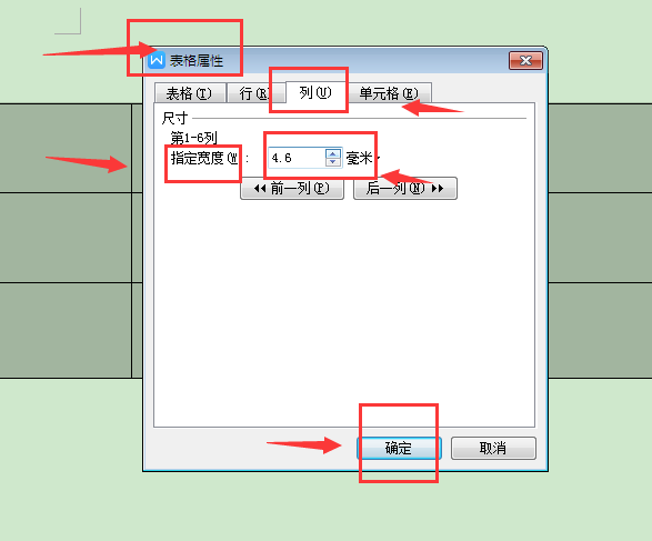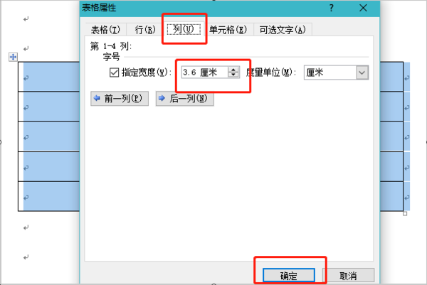 2、在弹出的表格属性设置框里,点击“列”一栏,则可以在下面的指定宽度里调整成你想要的宽度大小,点击下面的确定则可;