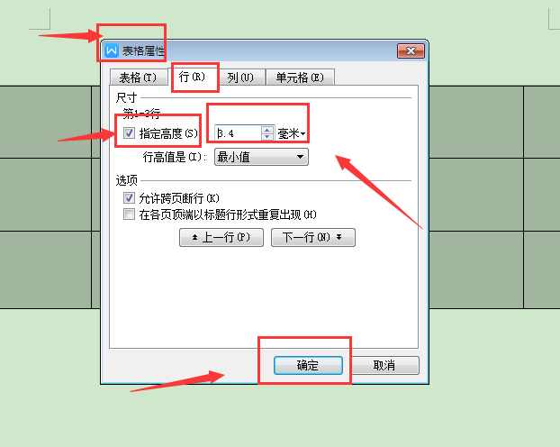 (2)、在打开的“表格属性”窗口中,切换至“行”选项卡,然后勾选“指定高度”项,即可精确的对所有行的行高进行设置。
