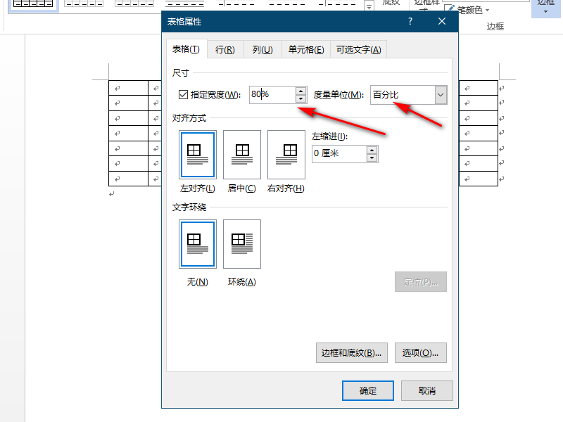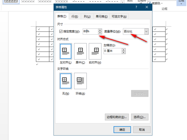 4、在表格属性页面中能够看到属性设置,将度量单位改成百分比显示,在指定宽度中填入80%。