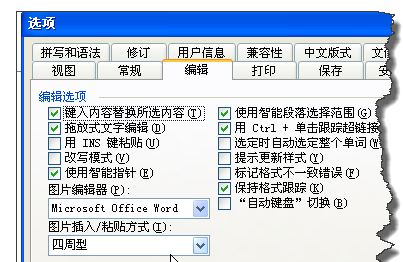 2.在”选项“窗口中,在”编辑”选项卡下,将插入图片的格式选择为“四周型”,为什么要这么操作,因为默认插入图片的方式是嵌入式,使用“选择多个对象”命令时无法选择。
