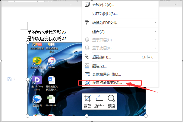3、右击图片后西安则弹出的对话框中最下方的设置对象格式选项。