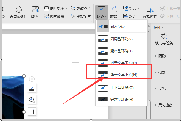 5、在扩展选项中选择负于文字上方选项。即可完成图片的任意移动设置。