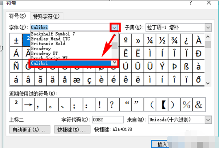 3、在符号页面点击【字体】后方的下拉箭头,拖动滚动条,找到并点击选择【Calibri】字体。