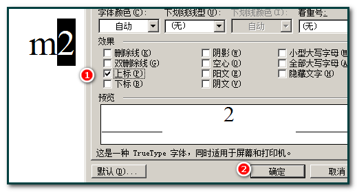 2、先在Word中输入个m2,然后用鼠标选中“2”,选择菜单栏的“格式”中的“字体”,在弹出的“字体”对话框下面的“效果”里面将“上标”钩选,然后确定就OK了。(如下图红色区域)