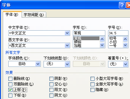 2、在弹出的字体对话框中,选中上标复选框,如图所示。