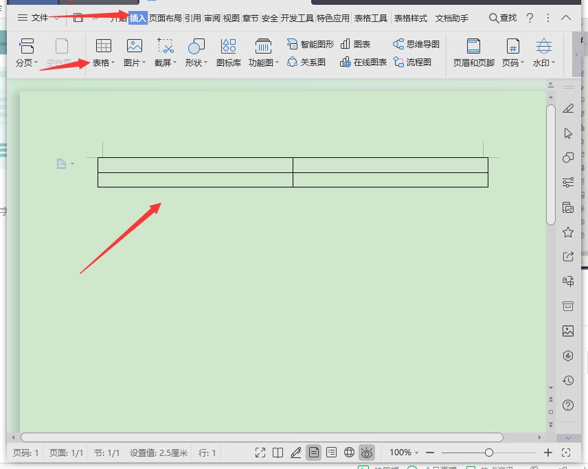 2、接下来在上方工具栏中选择“插入”-“表格”,插入一个2行2列的表格。