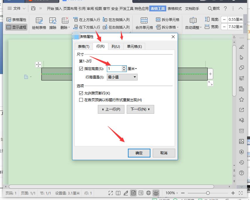 第二步:将表格全部选中,点开“表格---表格属性”,将行的“指定高度”设为