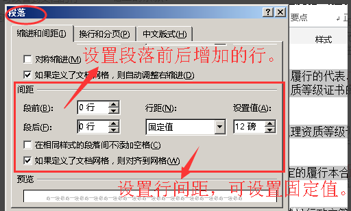 6、在段窗口--缩进和间距--间距中设置具体的段落间距和行间距,行间距可以设置为固定的数值,段落间距可以设置为几倍行距。