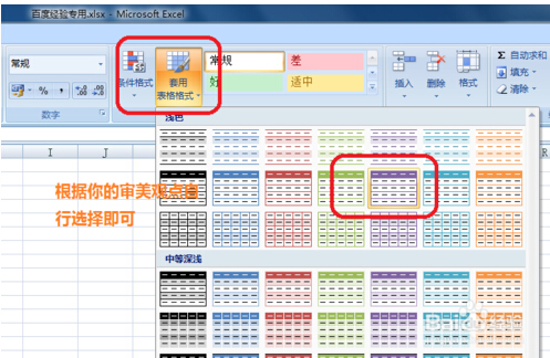 2、选择开始,找到套用表格格式选项。在下拉菜单中,选择入得了你法眼的一个表格模板。点击套用。