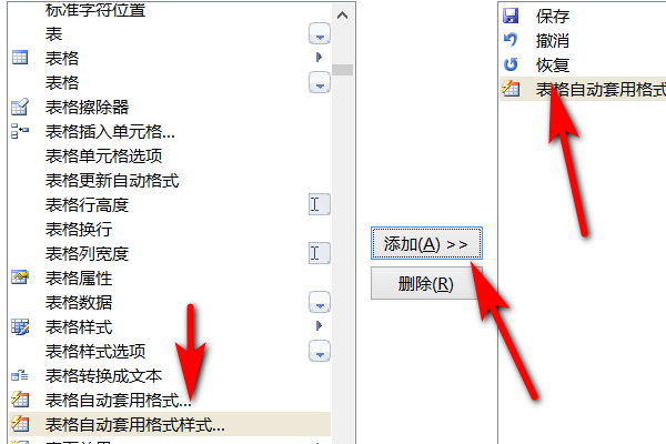 5、然后在所有命令里面找到表格自动套用格式,将这个命名添加到右手边的列表里面。