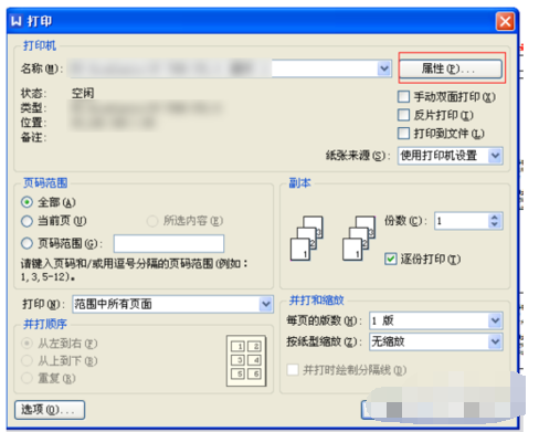 2.首先,选择自己所要用的打印机,然后点击右侧的属性进行纸张和纸盘的设置。