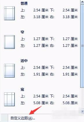 2、这时可以选择对应的各种类型的页边距,也可以点击下方的”自定义边距“,如图: