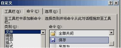 若只是保存按钮不见了,楼上两种解决方法可能不行,应该是这样操作:右键单击菜单栏或工具栏,然后弹出下拉菜单,单击“自定义(C)...”,然后选择第二个“命令”选项卡,选中左边最上面的“文件”,然后在右边把滚动条往下拉一点点就可以看到你熟悉的保存按钮了,用鼠标左键选中它并按住左键不放,然后把它拖放在工具栏适当位置放开鼠标,这样保存按钮就又回来了。
