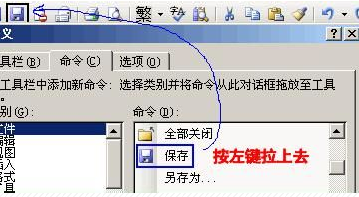 4、最后,如上图一样,在右边找到“保存”命令图标,按下鼠标左键将其拖到常用工具栏那里,word的保存按钮就回来了。