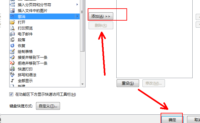 3、然后找到【撤销】单击选中后点击后面的添加,添加之后点击下面的【确定】保存设置就可以了。