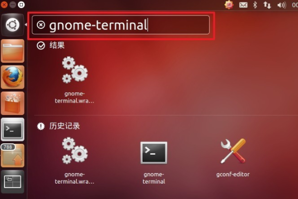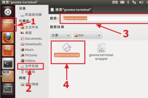 1、我们可以直接运行终端的可执行文件,单击ubuntu桌面左侧启动器内部的主文件夹,再单击文件系统,进入文件系统内部usr文件夹下的bin目录。单击“搜索”标识,在搜索框内输入“gnome-terminal”按回车键。在搜索结果中会出现“gnome-terminal”的可执行文件,双击即可打开。