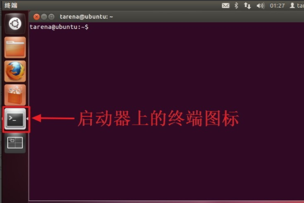 5、我们可以将终端通过拖拽的方式固定在桌面右侧的启动器上,通过单击启动器上的终端图标即可方便的打开应用程序。
