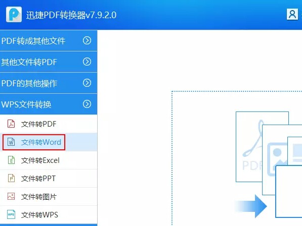 2、双击打开迅捷PDF转换器点击左侧工具栏中WPS文件转换,选择下级菜单中文件转Word。
