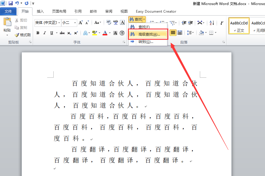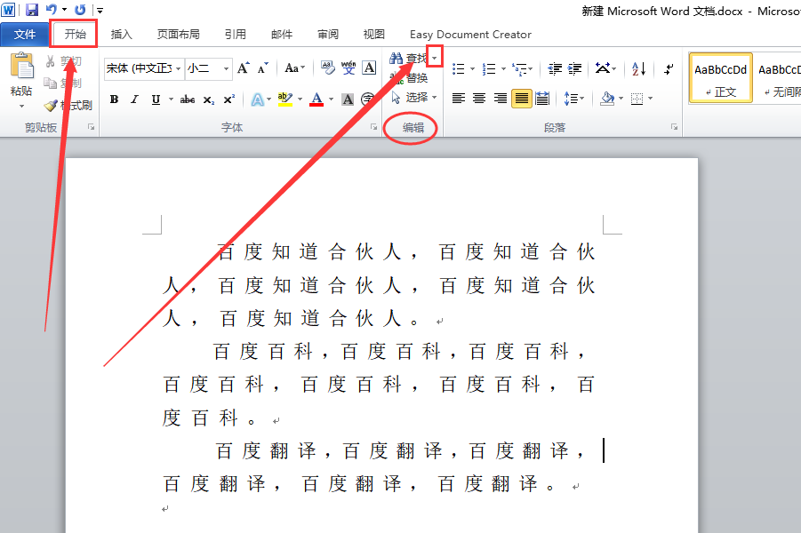 1、打开需要操作Word文档,在“开始”选项卡找到“编辑”一项,点击上面“查找”旁边的下拉菜单按钮。
