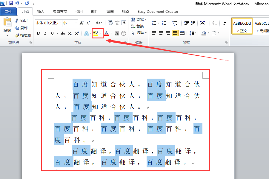 5、返回主文档,发现需要标记的文本都已经处于选中状态,在“开始”选项卡“字体”一项,点击“填充颜色”为选中的文本标记一个其他颜色即可。