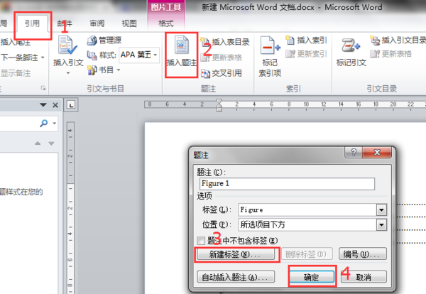 第一步:为要制作索引的图片图片插入依次题注,在点选图片后,在菜单栏中依次选择【引用】->【插入题注】->【新建标签】设置标签显示样子->【确定】。