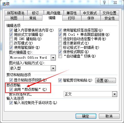 2、选择“编辑”选项卡,勾选“启用即点即输”即可。