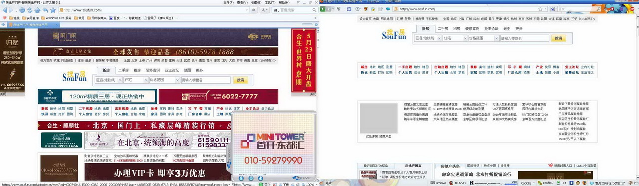 不知道你是什么配置,配置低的话更容易死机,很多时候浏览器死机是网页广告造成的,你看搜狐、新浪一打开又是视频又是广告的,这些广告占流量很大,尤其是打开页面的时候,集体弹出,很容易造成死机,换个广告拦截能力强的浏览器吧,新版火狐自带的ADBLOCKPLUS很强大,可以订阅屏蔽规则,可以拦截99%的网页广告,页面会清爽很多,看图吧,左边是世界之窗打开的搜房,右边是火狐,一目了然了。