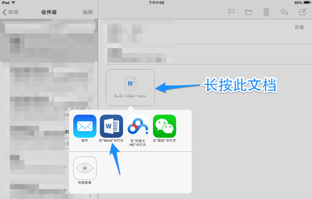 6,这里以邮件中的 Word 文档为例,长按文档以后就会看到用 Word 打开的选项了,如图;