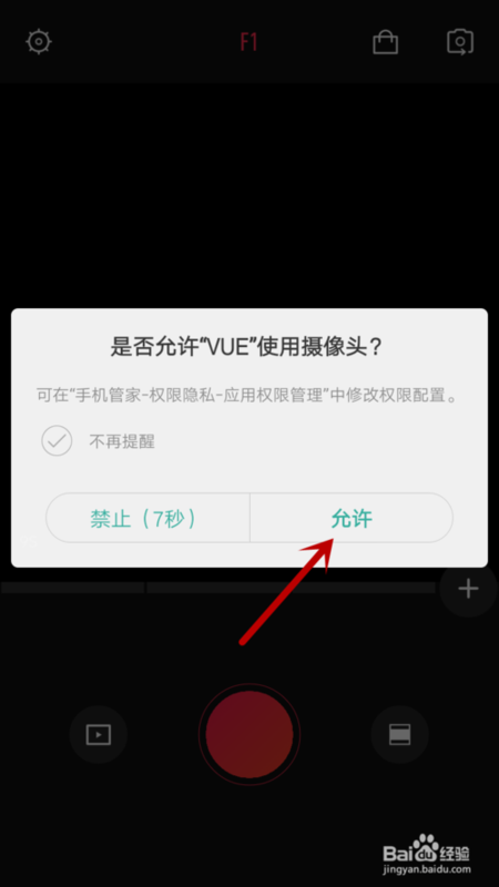 之后在打开过程中会弹出是否允许vue使用摄像头的提示,我们点击“允许”,因为只有拍摄视频后,才能添加音乐,不可以单独添加音乐没有视频。所以必须打开摄像头,按照要求拍视频才可以添加音乐。