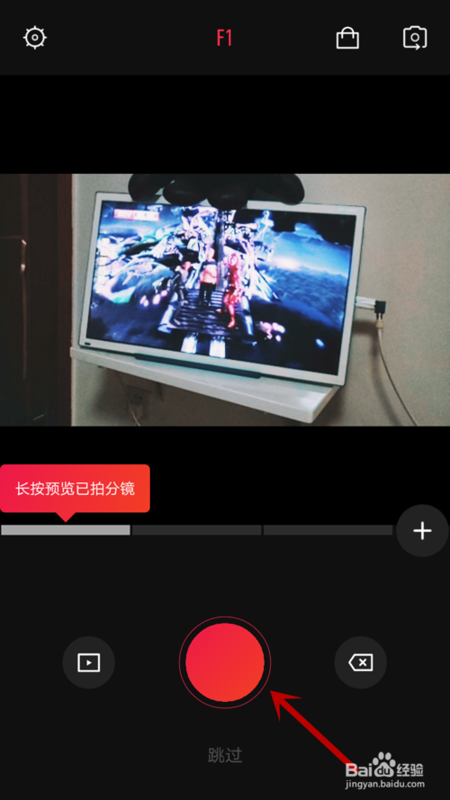 之后我们进入到vue的主界面,我么点击下方的那个大红按钮,即可开始拍摄视频,需要分别拍摄三段才可以,每拍完一段视频,点击一次那个红按钮。每一段时间很短也就2秒钟。三段拍摄完毕即可进入添加音乐的界面,进行添加音乐。