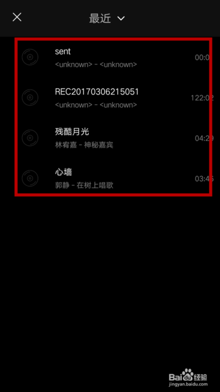 之后点击做下面左侧第一个“从手机选择”,即可打开手机中的音乐列表,如果没有的话,我们需要先将需要的音乐下载到手机中才可以添加音乐。