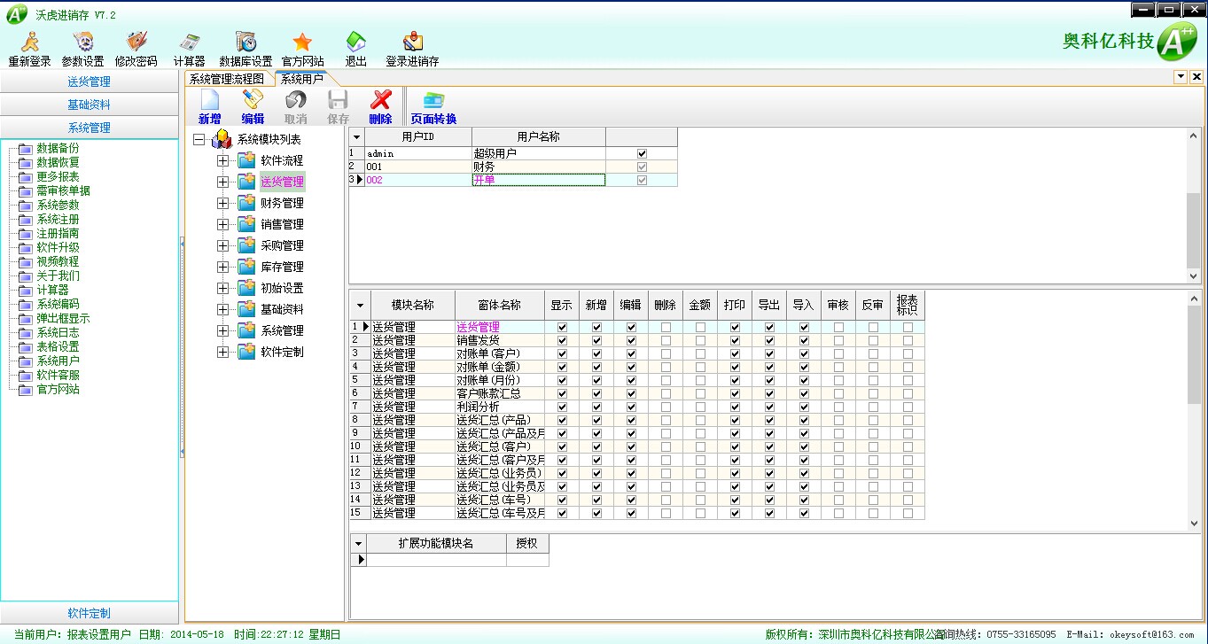 在软件的【系统维护】--------【用户管理】中,可以看见用户操作员如:系统管理员、开单员;